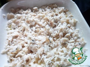 Отварную рыбку мелко режем, выкладываем на картошечку.
