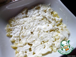Полторы картофелины отложить в сторону, две с половиной нарезать мелкими кубиками и уложить на дно салатника. -