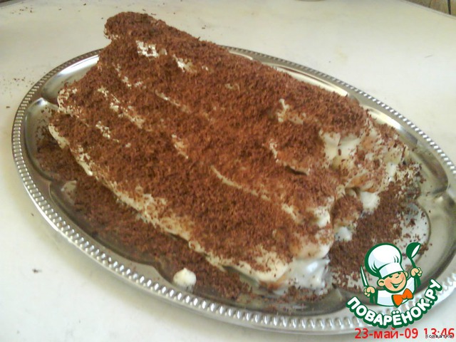 Бока торта смазать кремом и украсить тертым шоколадом.