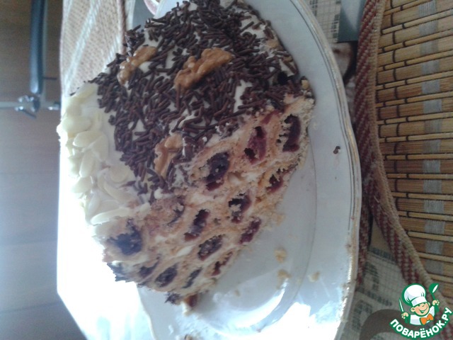 Очень вкусный тортик с вишневым вкусом (можно использовать как вишневое варенье, так и свежие вишни, только с добавлением сахара). Особенно вкусен тортик, если успеет пропитаться.