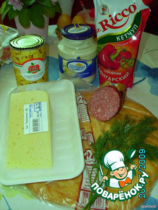 Одну из них смазываем майонезом, кетчупом. Сверху выкладываем кусочки колбасы.