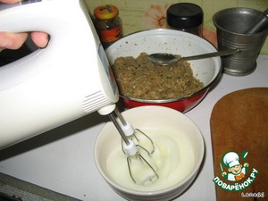Белки взбить отдельно в пену. Ввести в два приема в фарш, осторожно перемешивая. Пока фарш настаивается, приготовить грибную начинку.
