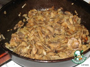 • Грибы нашинковать и прожарить на растительном масле, добавляя лук, чеснок и соль по вкусу.