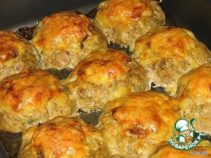 • Форму для запекания смазать маслом. Из фарша сформовать котлеты, сделать в них небольшое углубление и заполнить грибной начинкой.