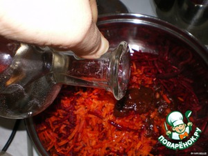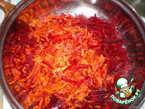 В разогретое масло выкладываем тёртую свеклу и морковь, пассеруем 3-4 минуты. -