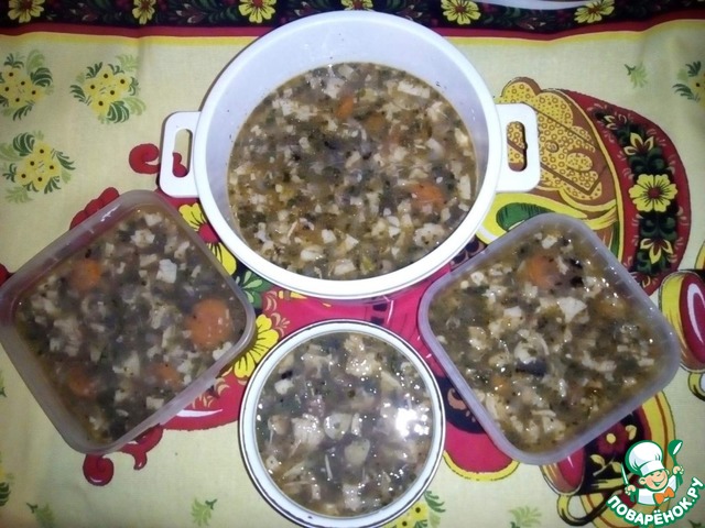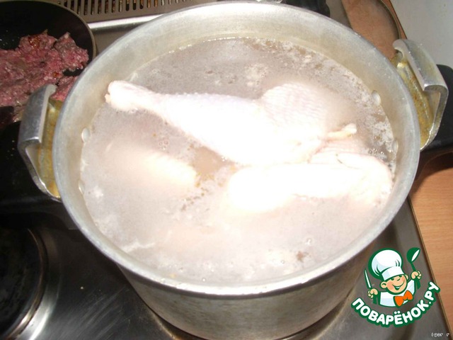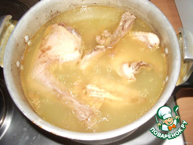 Через мин. 40 - 1 час овощи выбросить, а бульон поставить охлаждаться. За это время надо разобрать мясо, кожу куры выбросить, все кости погрызть. Мясо обмотать пищевой пленкой и отправить в холодильник. -