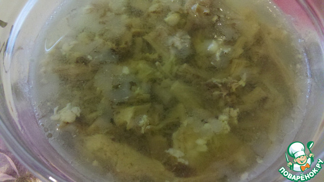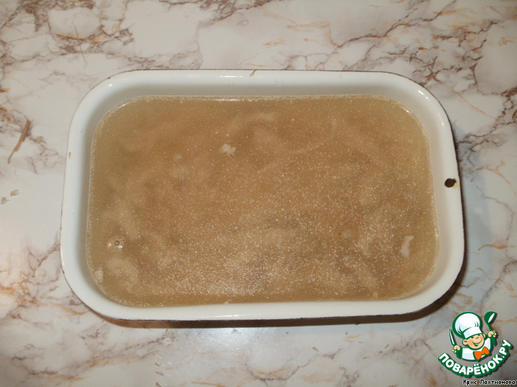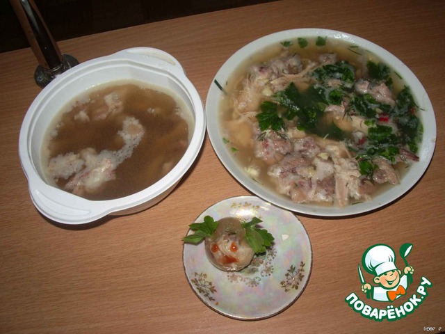 Убрать в холодильник или на балкон (как у кого температура). Через пару часов можно наблюдать результат. Слева - холодец классический (без зелени и уксуса), справа и по центру конечный результат.