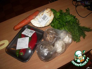 Посолить (у меня около столовой ложки соли ), через 5 мин вытащить мясо, бульон процедить, добавить овощи (морковку, луковицу, кусок корневого сельдерея, кусок репы).