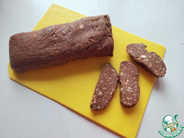 Массу выложить на пищевую пленку и сформировать колбаску.