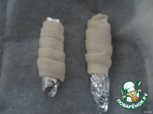 Я взяла ложку, обмотала ручку фольгой и на фольгу намотала полоски теста. -