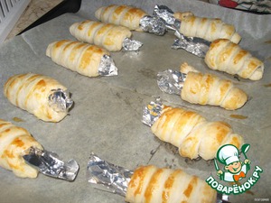 Слоеное тесто раскатать и нарезать на неширокие полоски ~3 см шириной и длиной примерно 20-25 см.