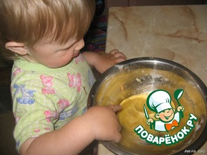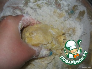 • И оставшуюся муку. Её может потребоваться чуть больше, смотрите по тесту. Оно должно получиться мягким, но немного рыхлым, когда от него отрываешь кусочек.
