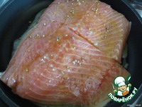 Обмажем оливковым маслом и обсыпим семгу крупной солью с двух сторон, выложим ее на блюдо, шкуркой вниз;