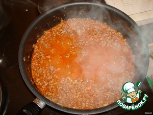 Затем добавляем фарш. Когда фарш дойдет до готовности, добавляем помидорную смесь и несколько ложек вермута. -