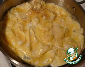 Влить в масло, поднимать загустевшие яйца, чтобы все быстрее пожарилось. Здесь 1 минуты достаточно, чтобы яйца не стали сухими.