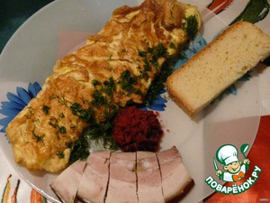 Свернуть рулетик: помогать вилкой, два раза справа налево и затем левый край положить сверху, прижать вилкой омлетик к сковороде секунды на 3-4.