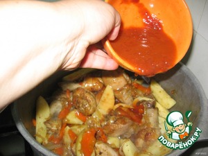 Развести томатную пасту в миске с водой и залить наше жаркое