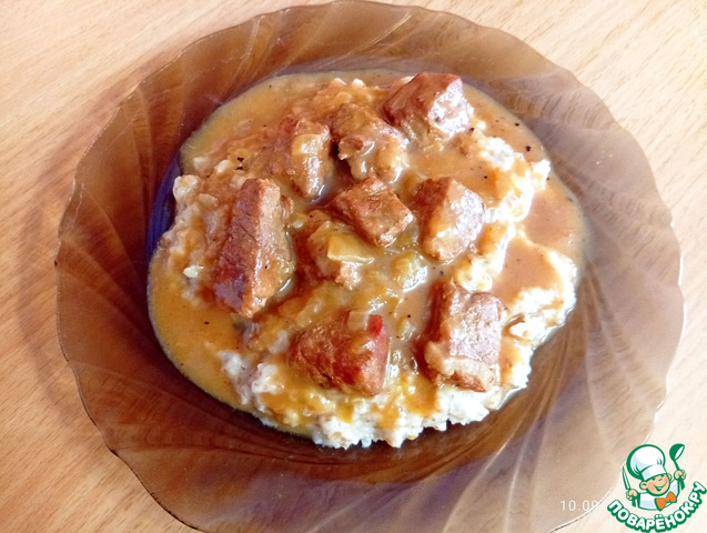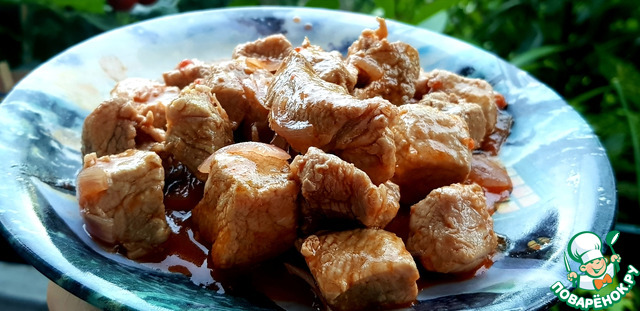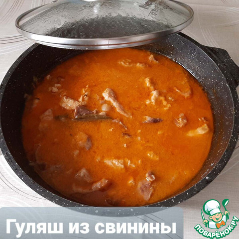 влить в гуляш 1-2 стакана воды или мясного бульона, перемешать, добавить лавровый лист, накрыть крышкой и тушить на маленьком огне при слабом кипении ~1-1,5 часа.