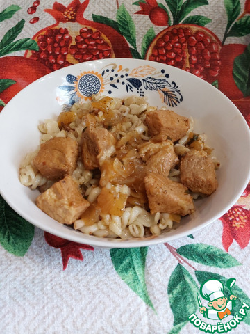 В сковороде разогреть масло и обжарить лук, чуть позже добавить к нему мясо и жарить, периодически помешивая, ~5-7 минут на среднем огне.