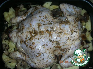 12. Грибами фаршируем курицу, скалываем кожицу зубочистками. Укладываем ее на противень