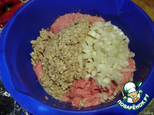 • Выкладываем фарш в чашку, добавляем геркулес, мелко нарезанную луковицу