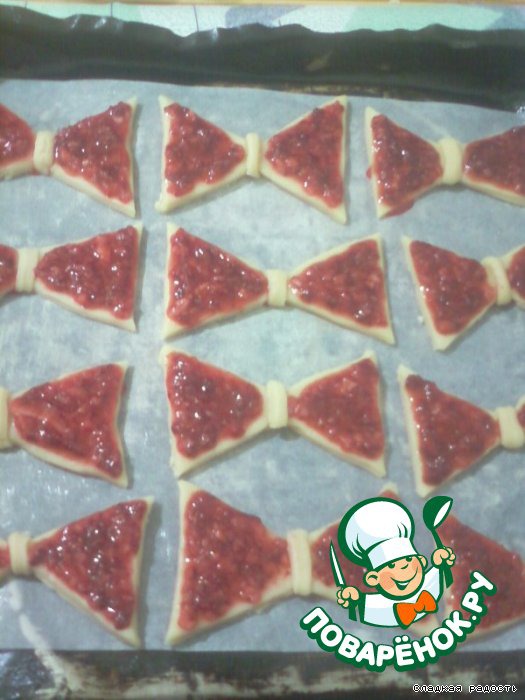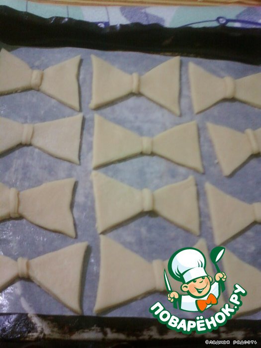 Раскатать тесто (0,5 мм) и сделать вот такие бантики.