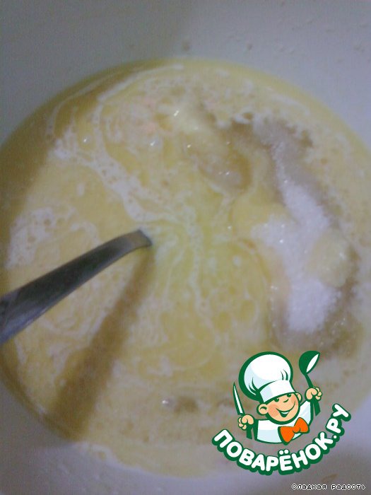 Затем добавить растопленное масло и сахар.Хорошо перемешать.