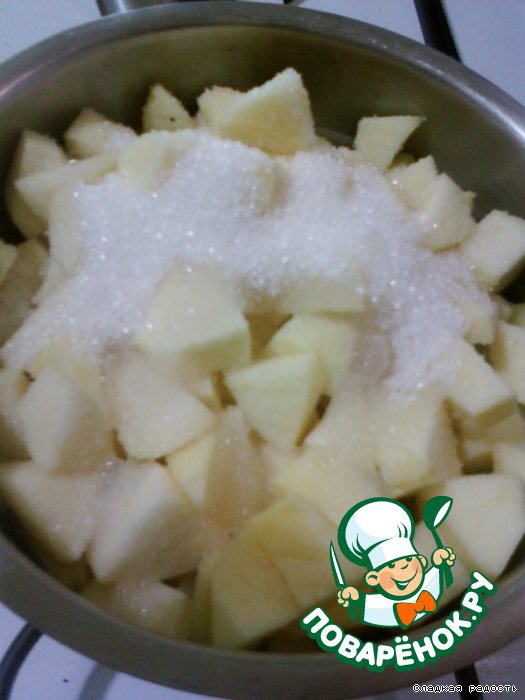 Яблоки почистить от шкурки и сердцевины. Нарезать кубиками, сложить в кастрюльку, добавить воды и сахара.