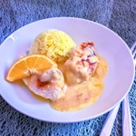 Выкладываем на тарелочку, добавляем на гарнир рис, поливаем получившимся соусом и посыпаем петрушкой.