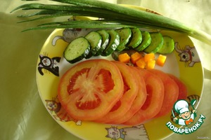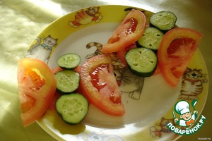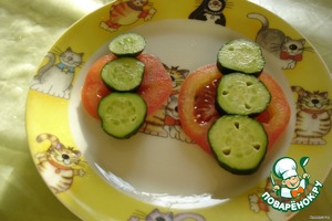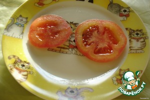 Самый большой кружочек помидора разрезаем на две половинки и выкладываем по бокам.