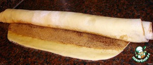 Приготовить сухую смесь сахара и корицы, обильно и равномерно обсыпать смазанное маслом тесто-следить за чистотой полоски