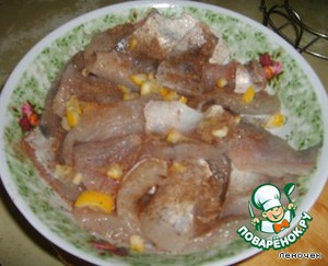 Филе судака, разрезанное на ломтики, замариновать с приправами и солью, добавить сок и кусочки лимона.