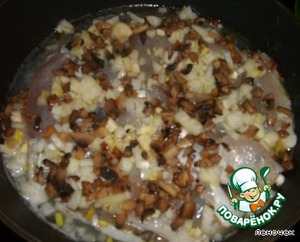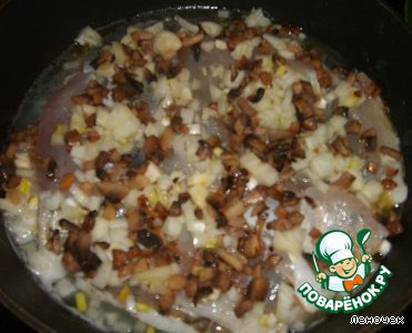 Выложить рыбу в сковороду с толстыми стенками. Посыпать нарезанным луком и частью тушеных грибов, добавить вино, накрыть крышкой и тушить минут 20.