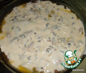 Сверху выложить оставшиеся грибы и залить майонезом, -