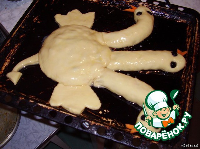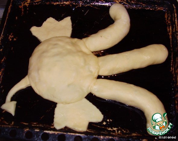 Края обрезать и защипить кончиками пальцев. Это туловище. Выкладываем его на протвень, смазанный растительным маслом.