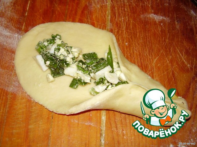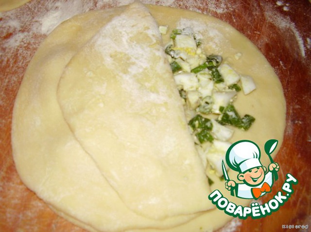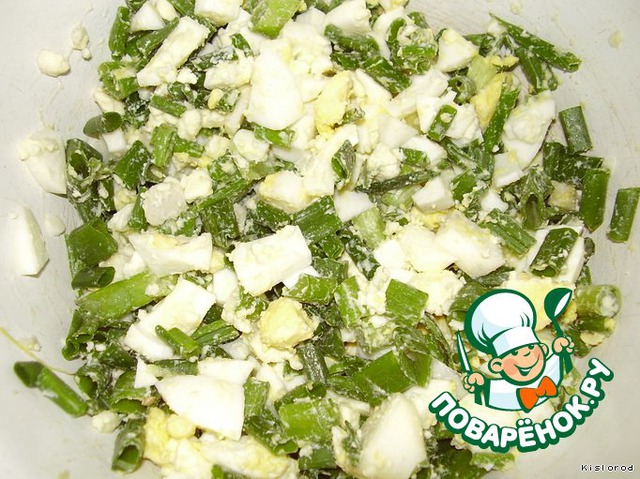 За это время приготовить начинку для пирога: 3 яйца сварить, очистить, нарезать кубиками и смешать с рубленым зеленым луком и 1/2 ч. л. соли. Перемешать.