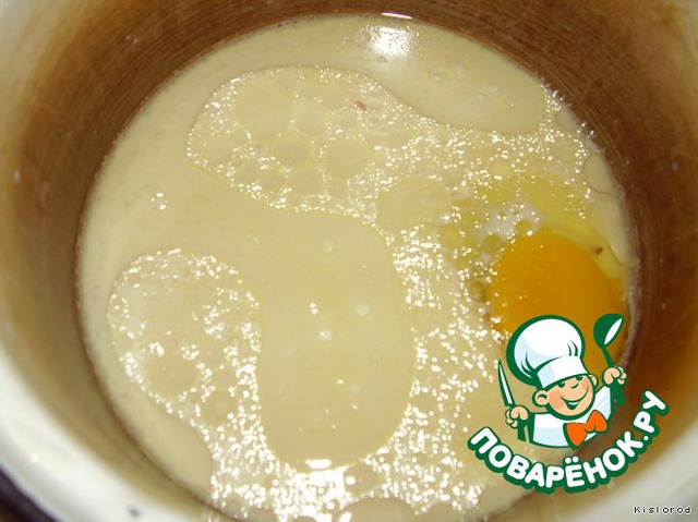 В теплом молоке развести дрожжи, добавить 1 яйцо, сахар, соль и растительное масло. Перемешать.