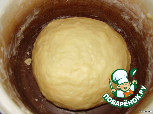 Добавить муку и заместить эластичное, не очень крутое тесто. Прикрыть полотенцем и оставить в теплом месте на 1,5 часа.