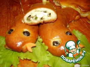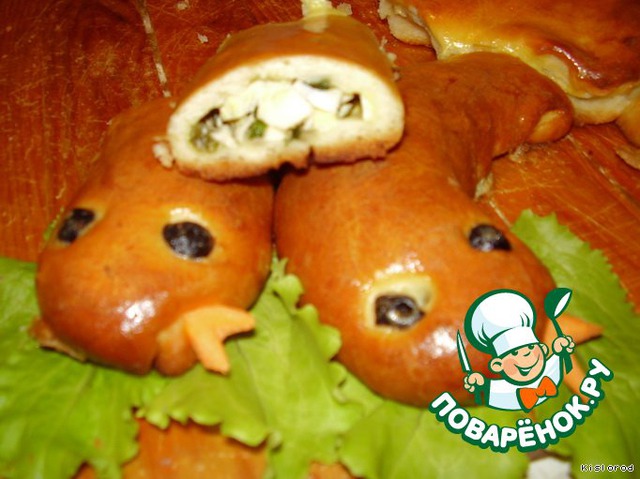 Теперь из второй половины теста деаем 3 головы: раскатываем небольшой овал, выкладываем на середину начинку и защипываем как пирожок. Укладываем на протвень к туловищу и немного изгибаем. Повторяем эту же процедуру еще 2 раза.