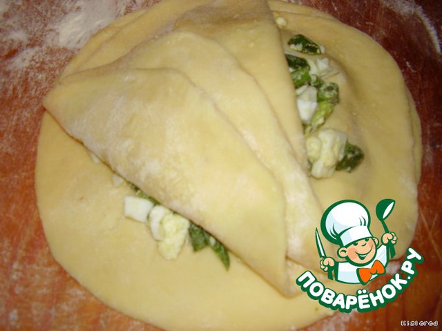 Рскатать 3 одинаковых круга из половины всего теста. На первый круг положить начинку и накрыть его вторым кружочком.