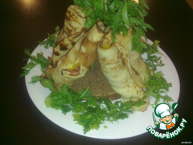 Для украшения как основу я взяла кусочек черного хлеба через всю буханку. Деревянными шпажками выложила шалашик. Сверху края скрепить ниточкой. И поверх шпажек уложить блинчики. Украсить зеленью