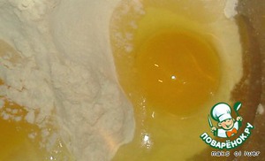 Засыпаем муку и разрыхлитель в ёмкость, разбиваем яйца.