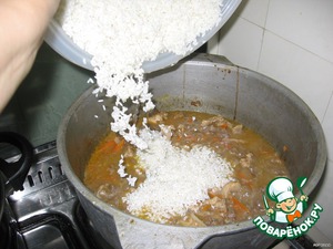 Кипятить массу минут 15-20 и засыпать рис, уже полежавший в воде с самого начала, как вы начали готовить.