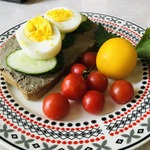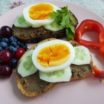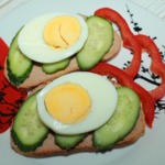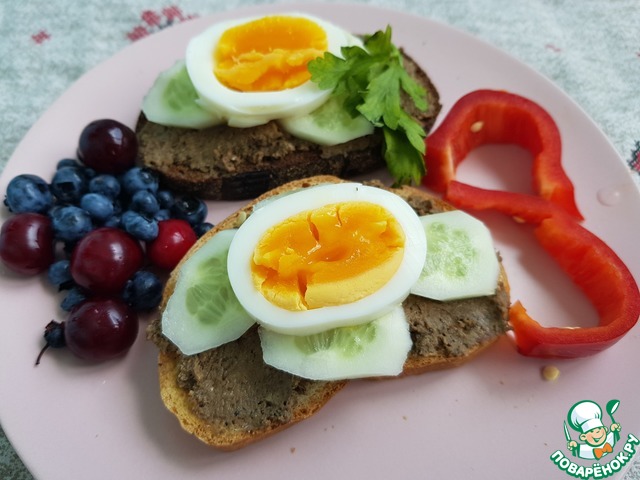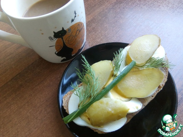 Кладем тонкий пластик огурца наверх и точно такой же пластик яйца поверх огурца.