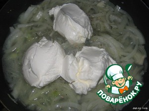 Добавляем сметану и немного воды. Солим и перчим - по вкусу.