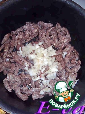 1. Мясо нарезаем тоненькой соломкой, лучше немного подморозить его, перед тем как нарезать. В этот раз я не стала этого делать, и соломка получилась толще, чем надо. Это увеличивает время тушения.
