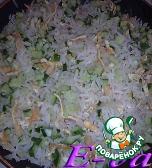 4. обжариваем рис на сковородке, добавляем нарезанный омлет, огурец и специи, о которых я написала выше.