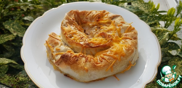 Когда хочется чего-то печеного, а времени с тестом возиться нет, но зато есть уже готовое вареное мясо и купленный заранее лаваш.......
