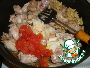 Добавляем в мясо нарезанные лук и помидоры. Шкурку с помидорок нужно снять