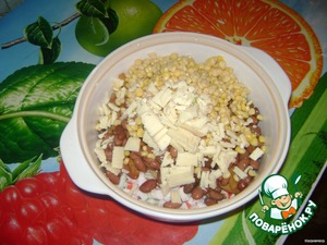 Пекинскую капусту, крабовые палочки, сыр нарезаем кубиками, добавляем фасоль, кукурузу, сухарики, соль.
